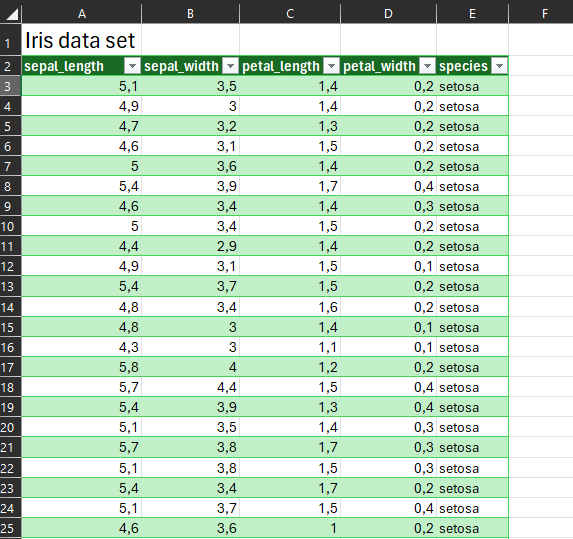 The dataset looks as follows, where the data is already converted to an Excel Table named “IrisDataSet2”.