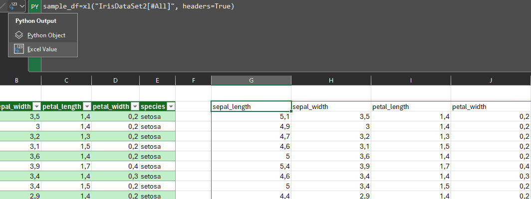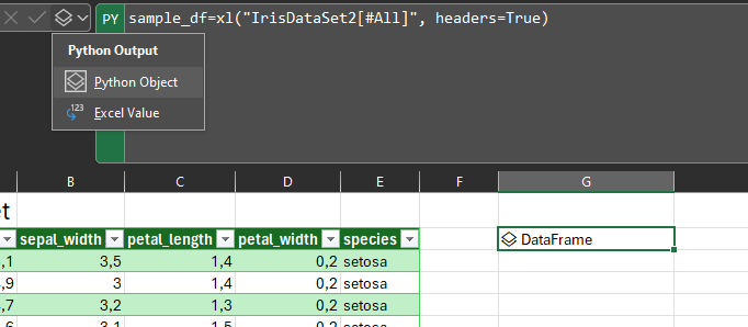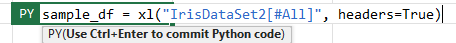 Here, we assign the variable sample_df , the data in Excel (hence the xl() function, note this is native to Excel only), first argument is the reference to the Table name, which is “IrisDataSet2[#All]”, where all columns are loaded. Finally, the variable headers=True is passed to indicate that the names of the columns, such as petal_lenth should also be included in the DataFrame. This is important because we can later call these columns, by their name, instead of numbers to indicate which column to look into.